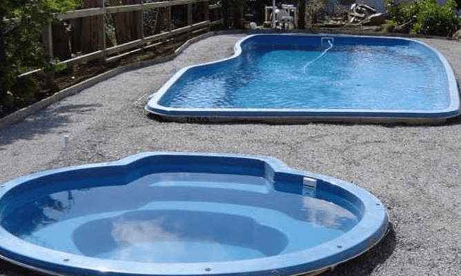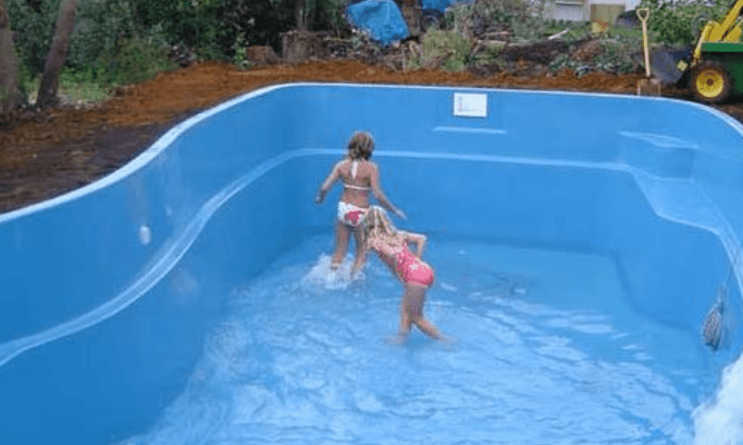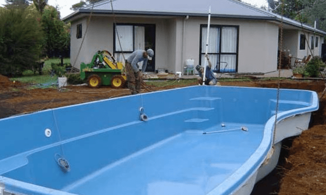 Pool is lowered into the hole. Levels checked. The pool shell has been fitted with lights and plumbing at this stage.