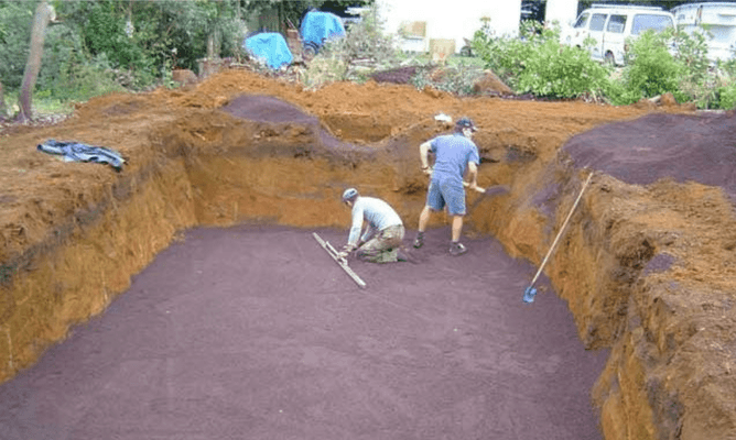The pool hole is dug by experienced operators. Base carefully leveled and compacted.